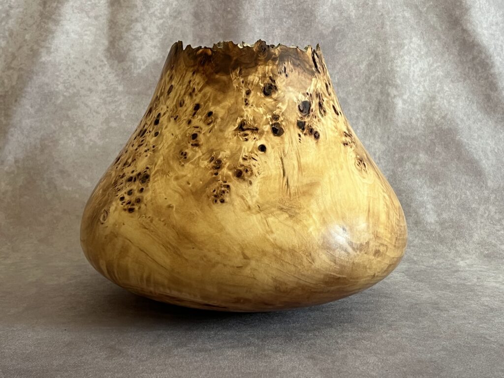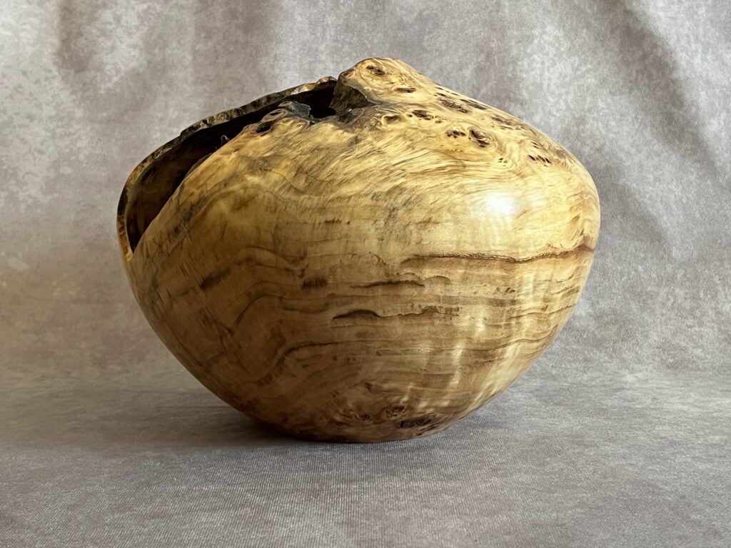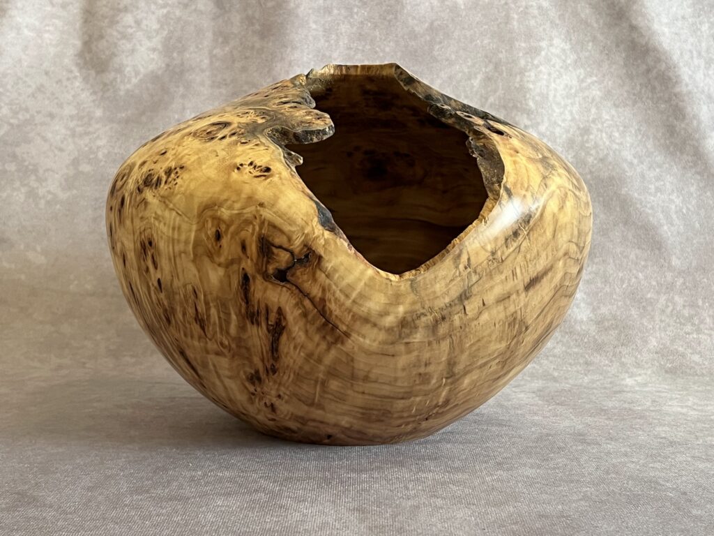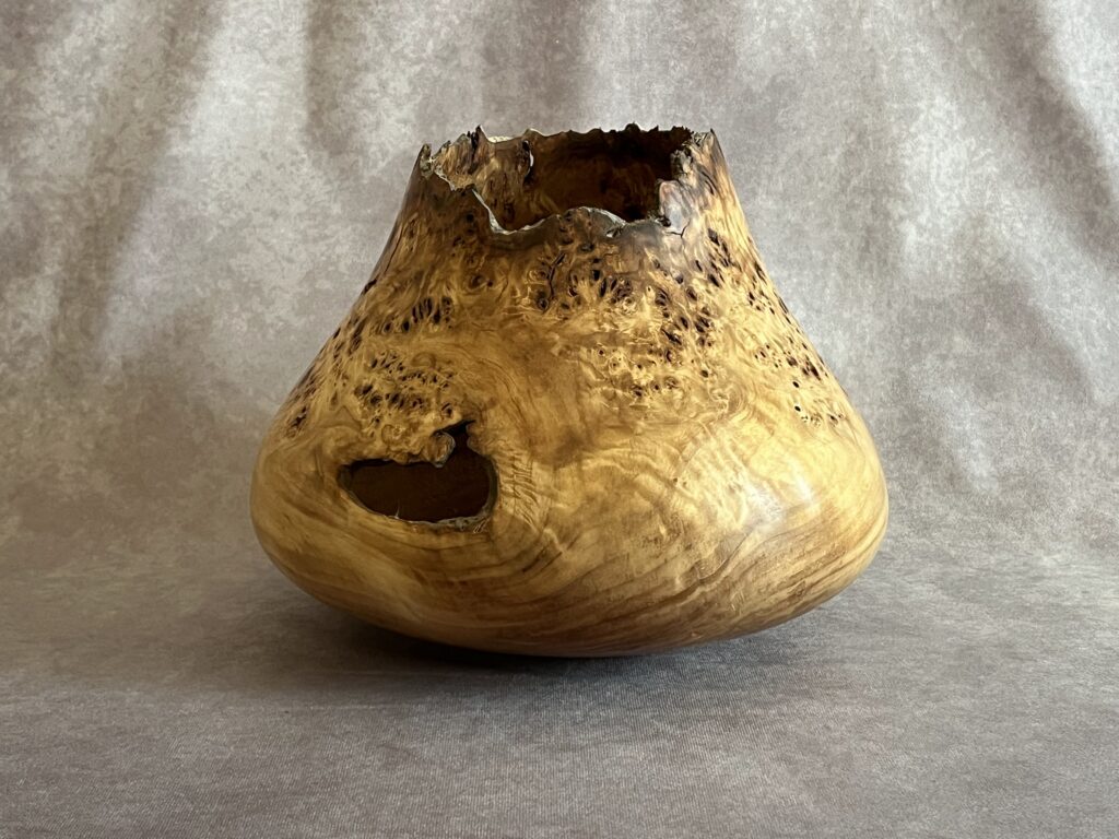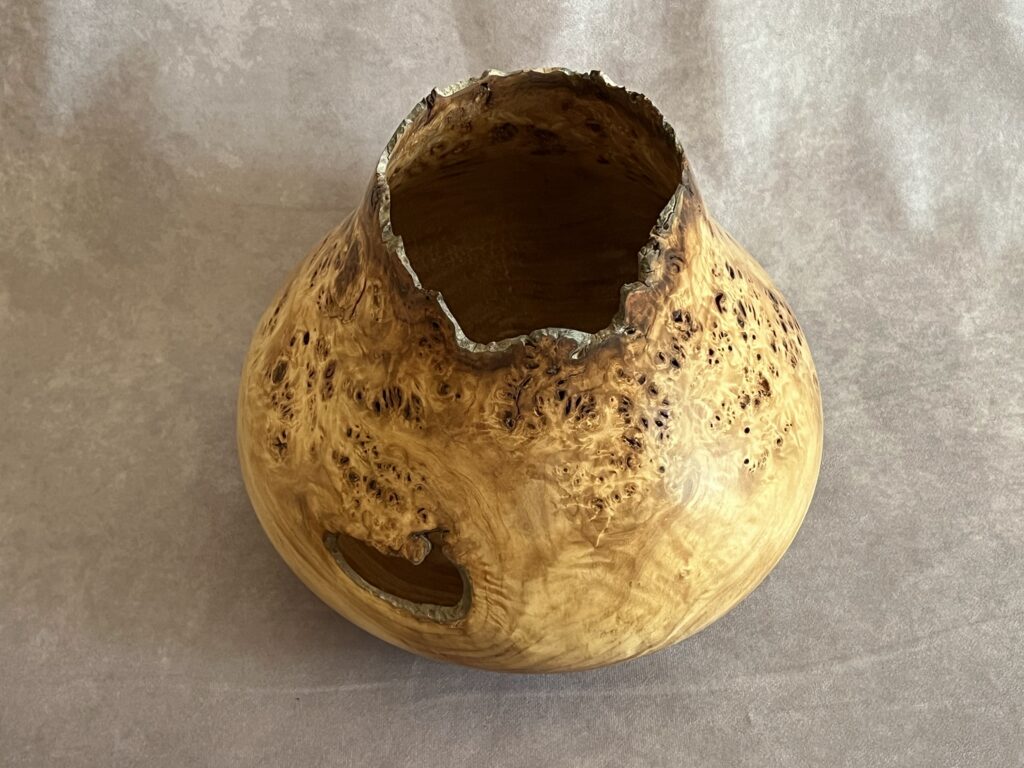 This is part of 6 piece collection that came from a Cottonwood tree in Belmar Park, Lakewood, Colorado (just outside of Denver). I had my eye on it for many years and when the forestry department marked it for cutting, I convinced them to let me take a van load. 9.5″ tall, 9 wide, 2″ opening, 1/4″ thick