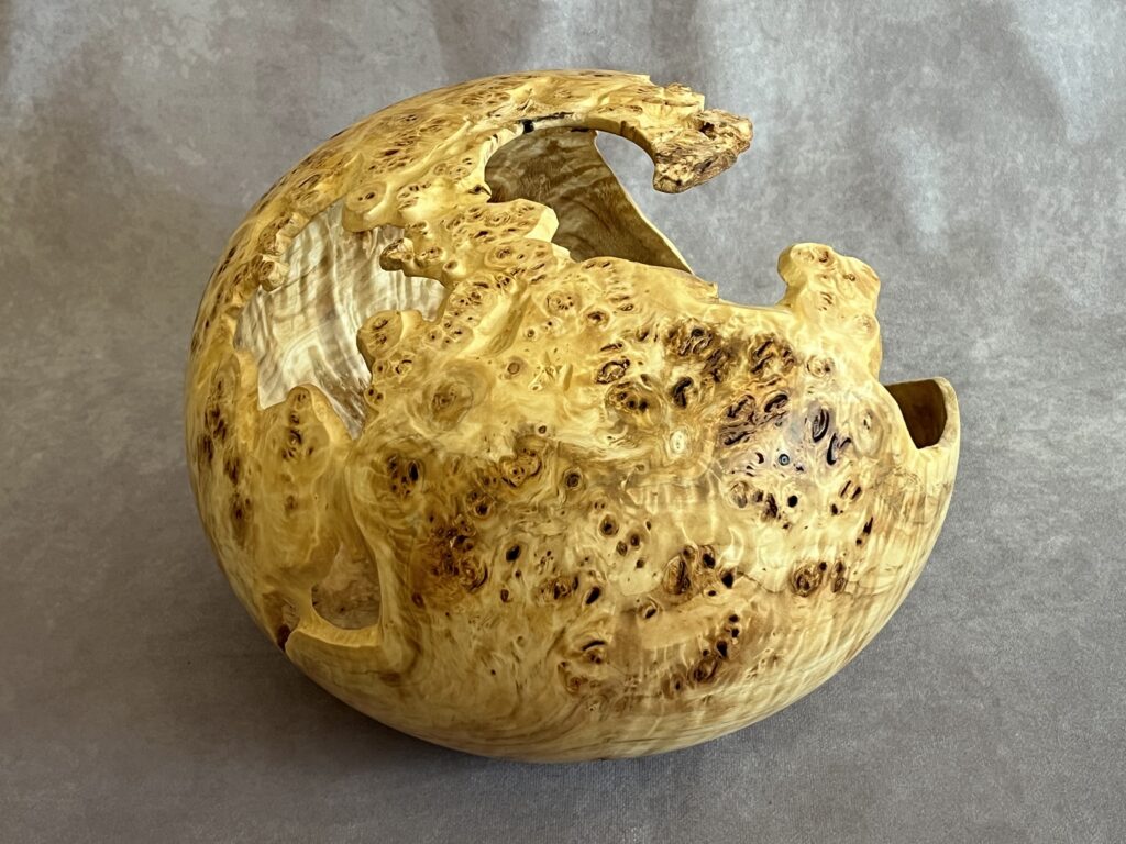 This piece was created from a gnarly block of nicely figured Box Elder burl. I chose to paint the interior a flat black to accentuate the natural voids. The base, which is also painted black, lifts the piece up, just enough to give it a more airy feel. 4 3/4″ tall, 7 1/2″ wide (3 1/4″ at the base), 2″ opening, 1/4″ thick