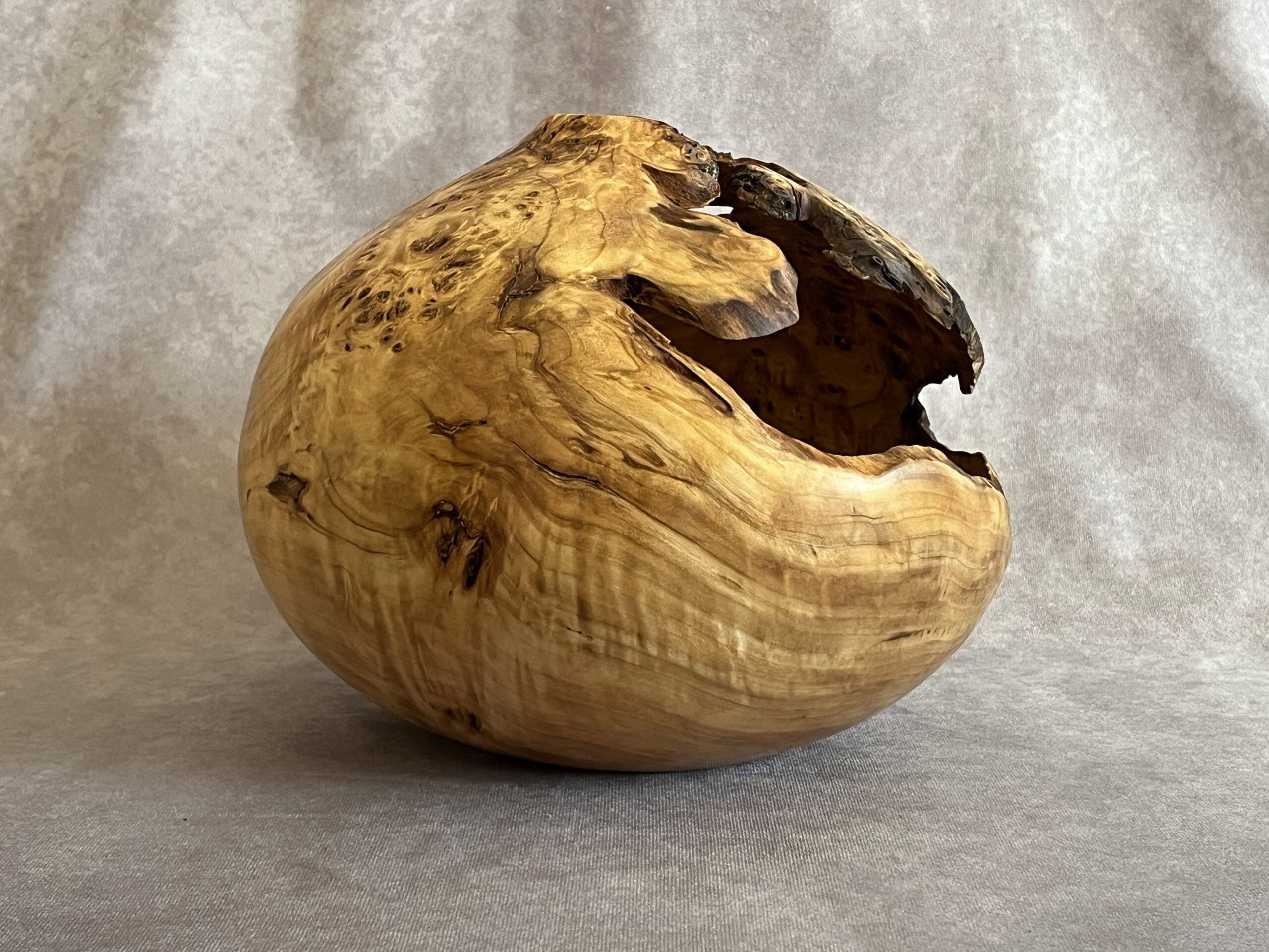 This is part of 6 piece collection that came from a Cottonwood tree in Belmar Park, Lakewood, Colorado (just outside of Denver). I had my eye on it for many years and when the forestry department marked it for cutting, I convinced them to let me take a van load. 9.5″ tall, 9 wide, 2″ opening, 1/4″ thick