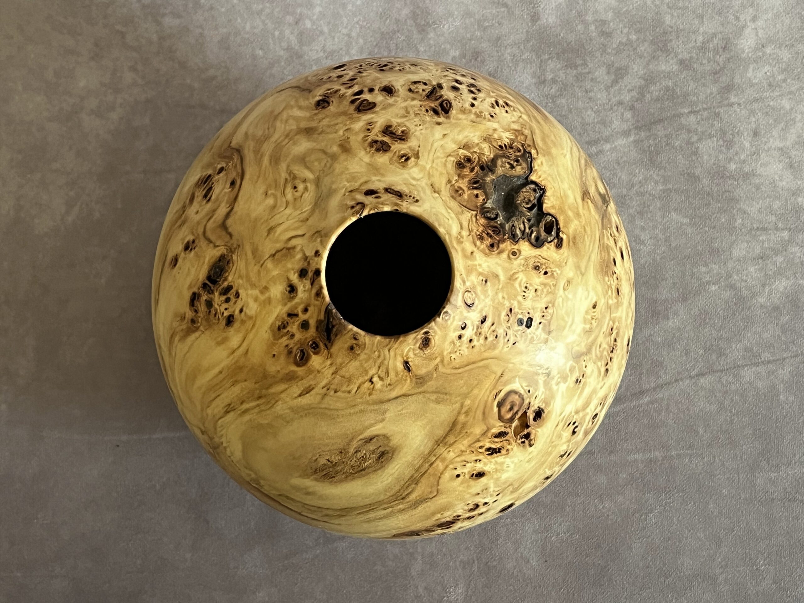 This piece was created from a gnarly block of nicely figured Box Elder burl. I chose to paint the interior a flat black to accentuate the natural voids. The base, which is also painted black, lifts the piece up, just enough to give it a more airy feel. 4 3/4″ tall, 7 1/2″ wide (3 1/4″ at the base), 2″ opening, 1/4″ thick