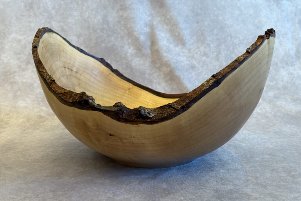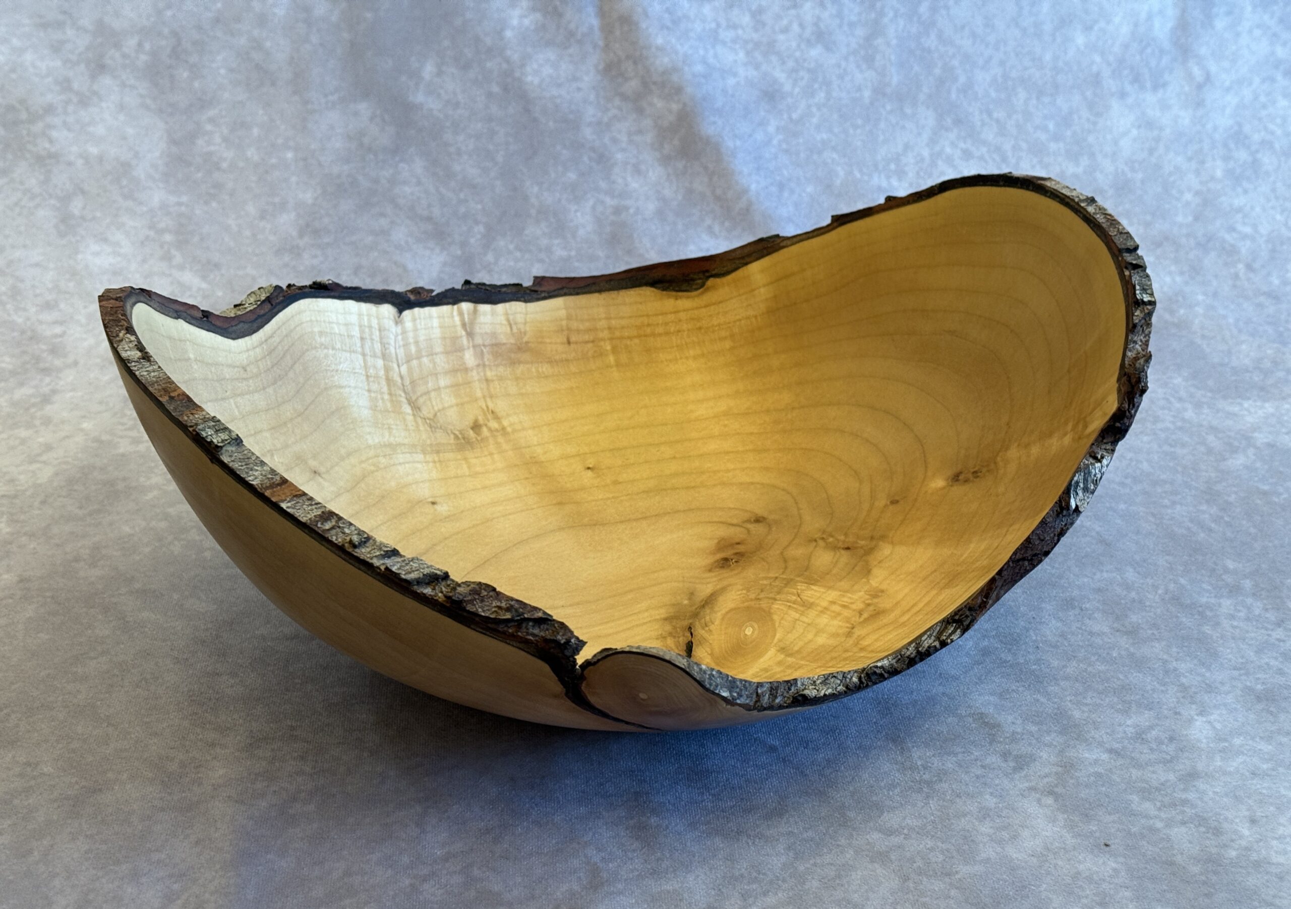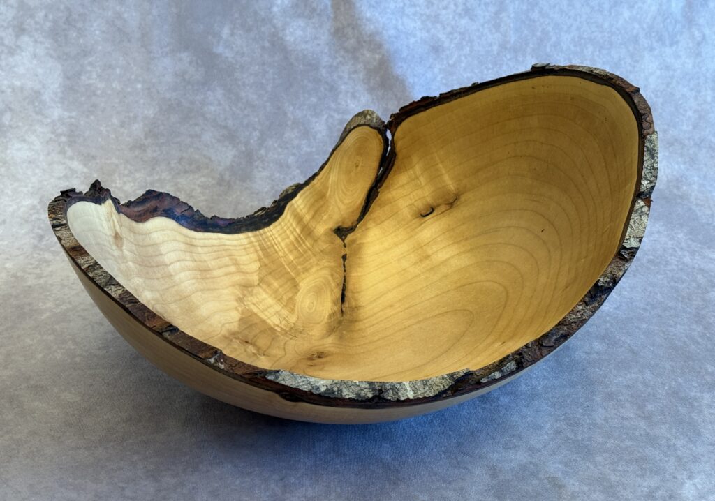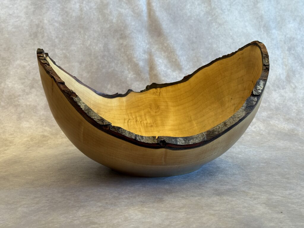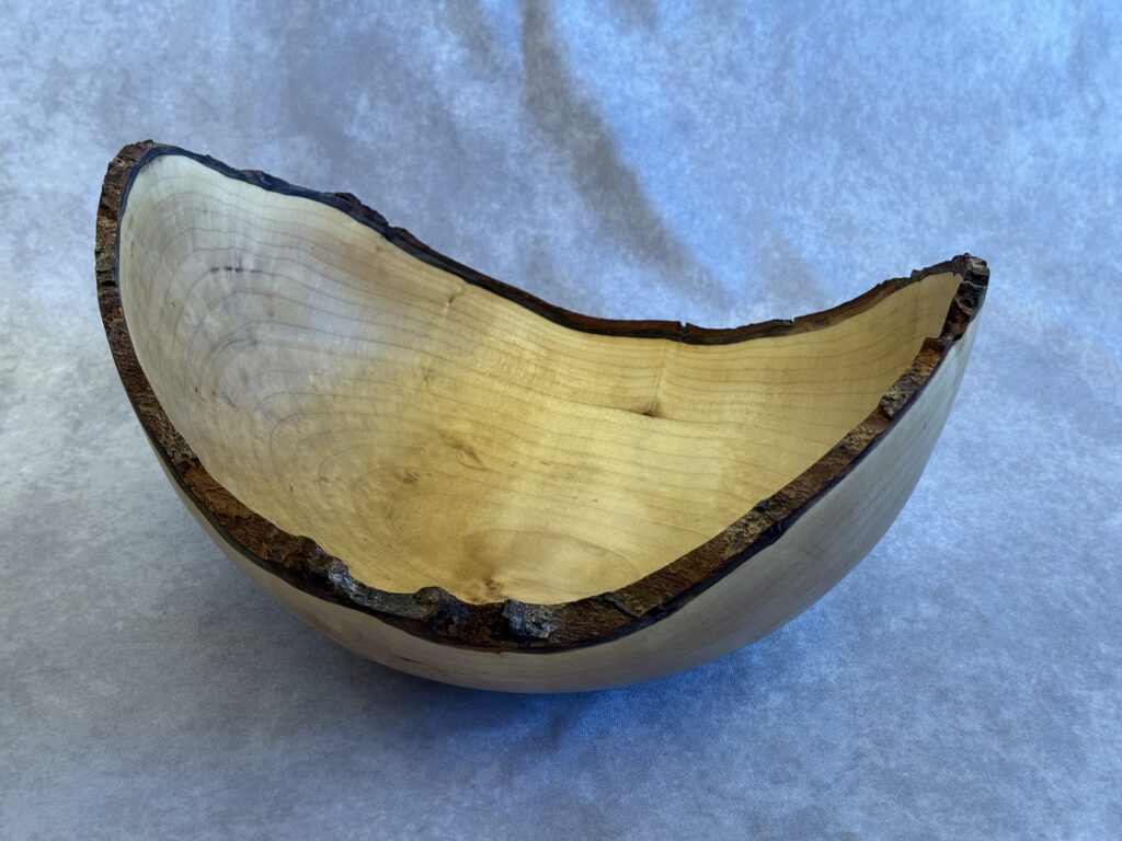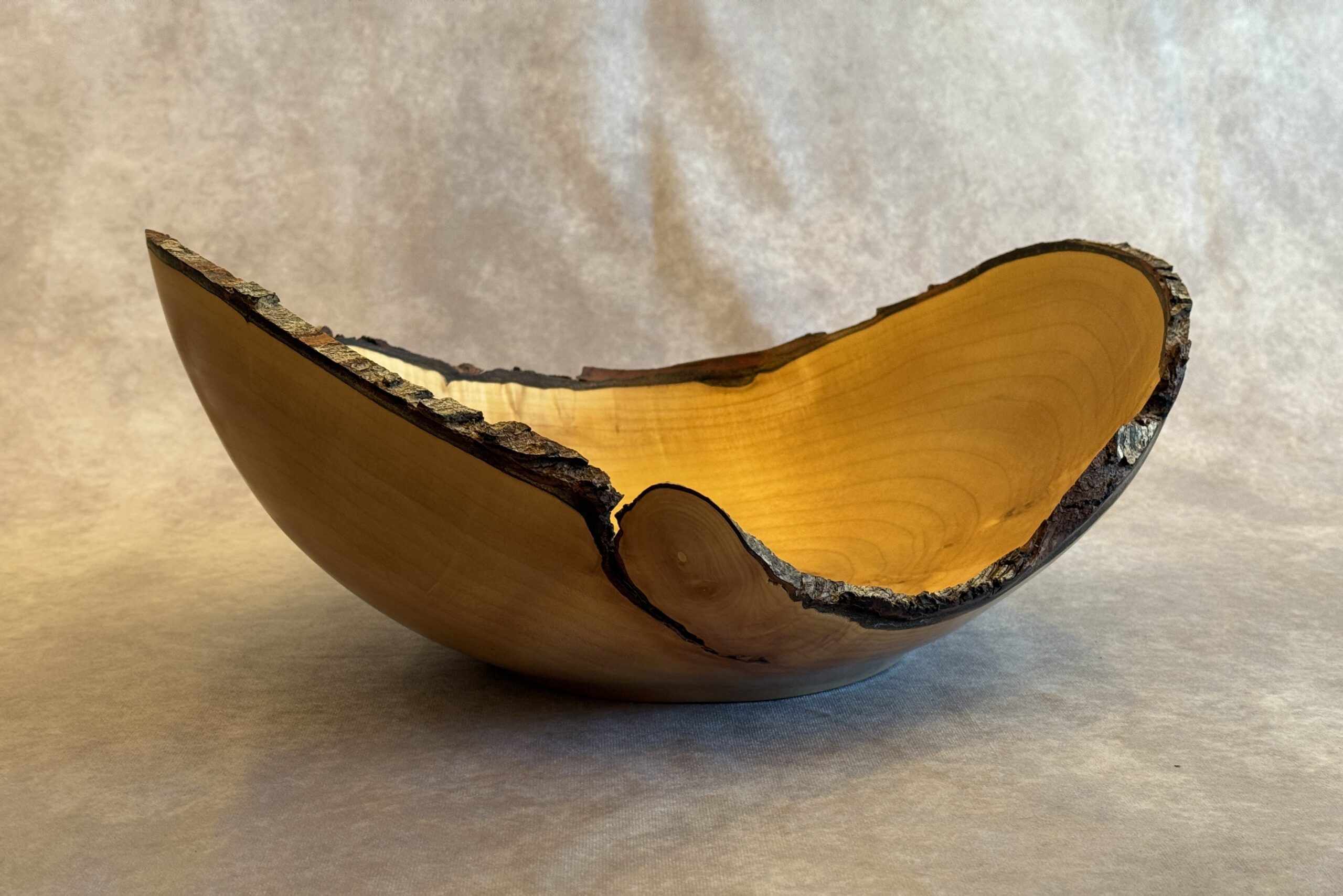 “Natural-edge” bowls are turned so that the rims are the outer face of the tree, many times including the bark. These forms are much more organic and most of the time, they are turned to their final thickness while green. This allows for the wood to warp while it dries, further imparting a more natural shape.