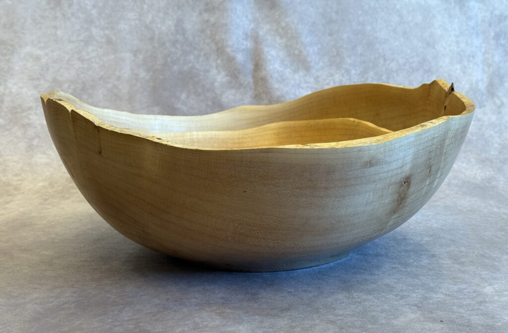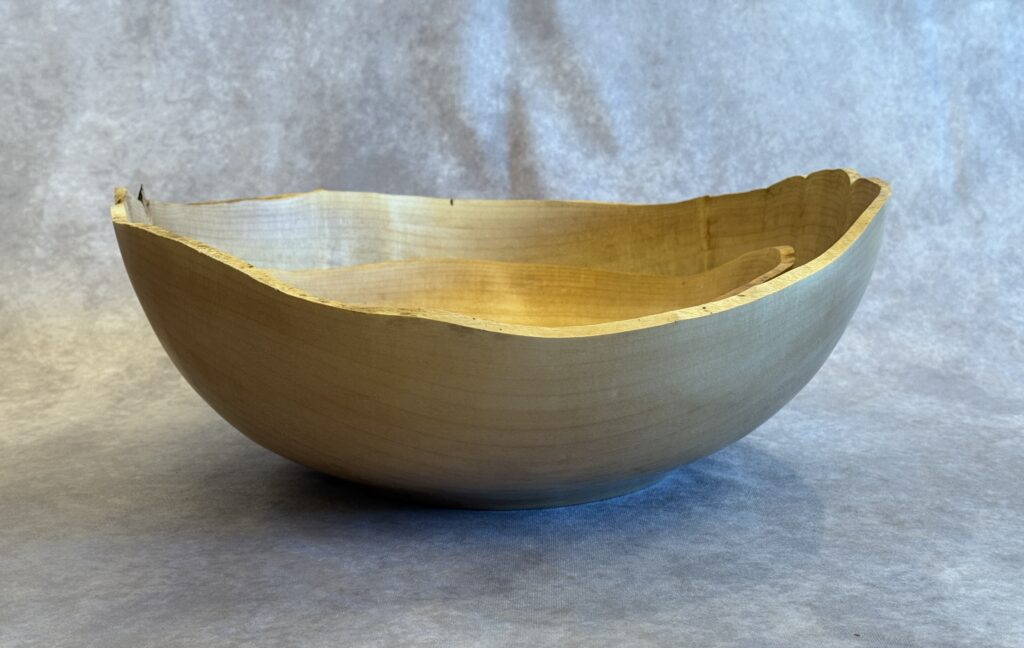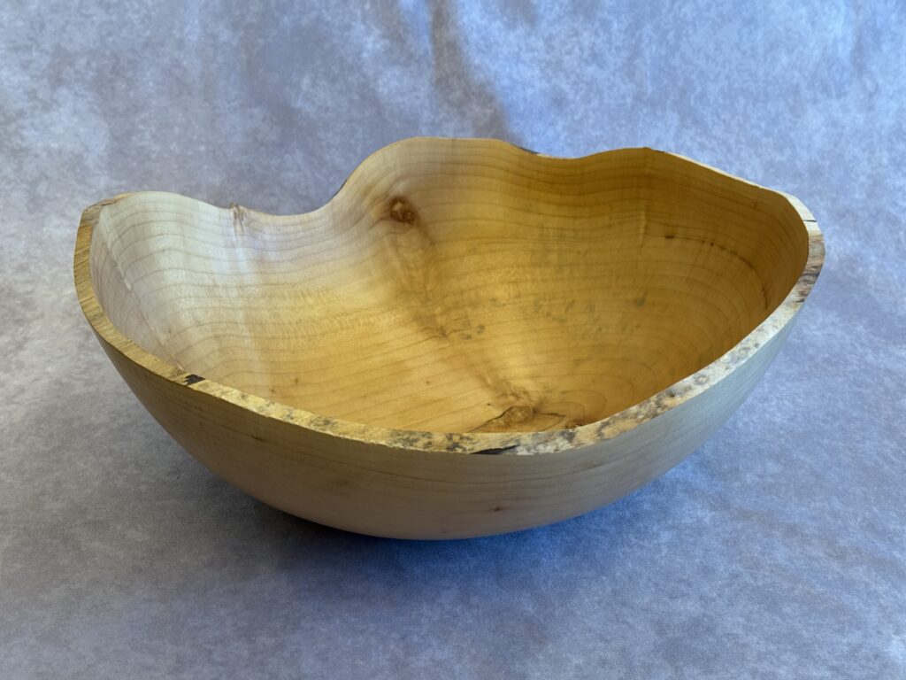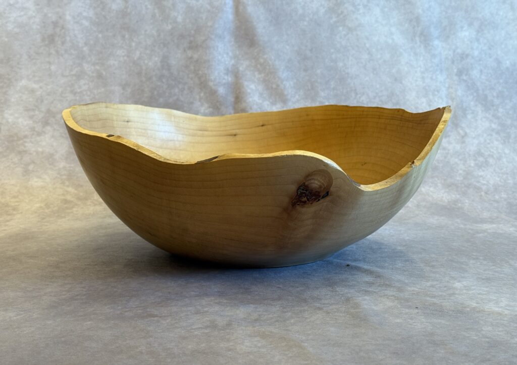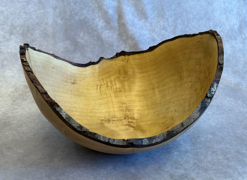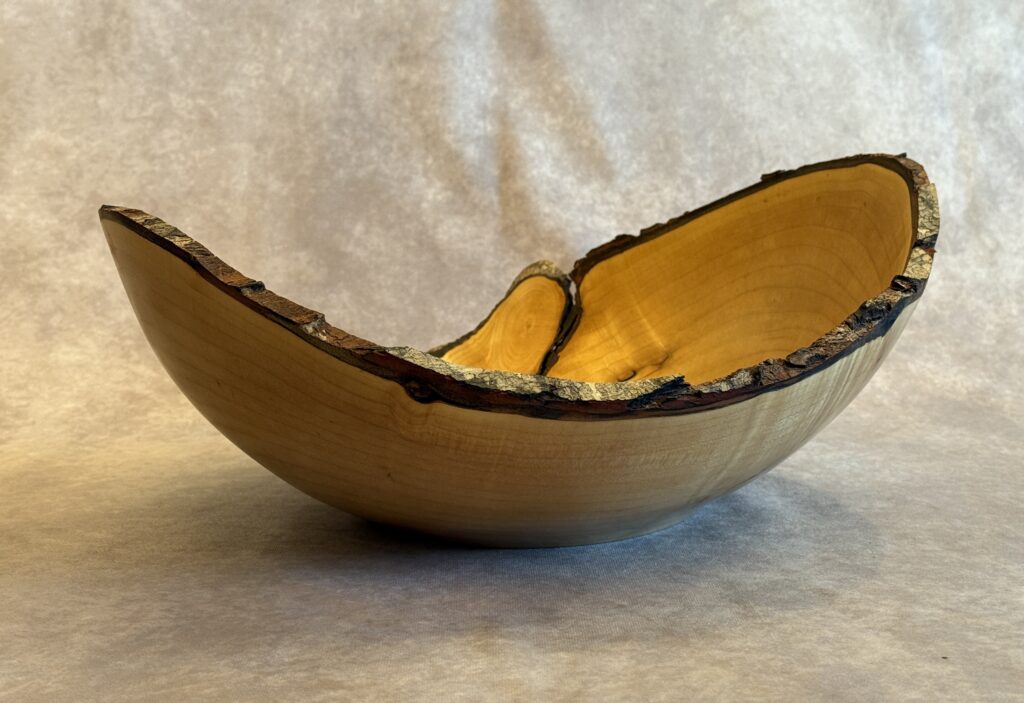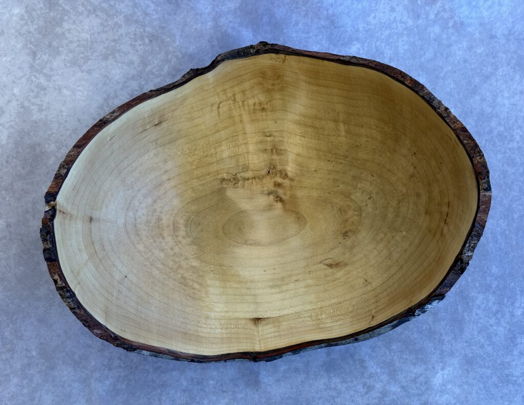 “Natural-edge” bowls are turned so that the rims are the outer face of the tree, many times including the bark. These forms are much more organic and most of the time, they are turned to their final thickness while green. This allows for the wood to warp while it dries, further imparting a more natural shape.