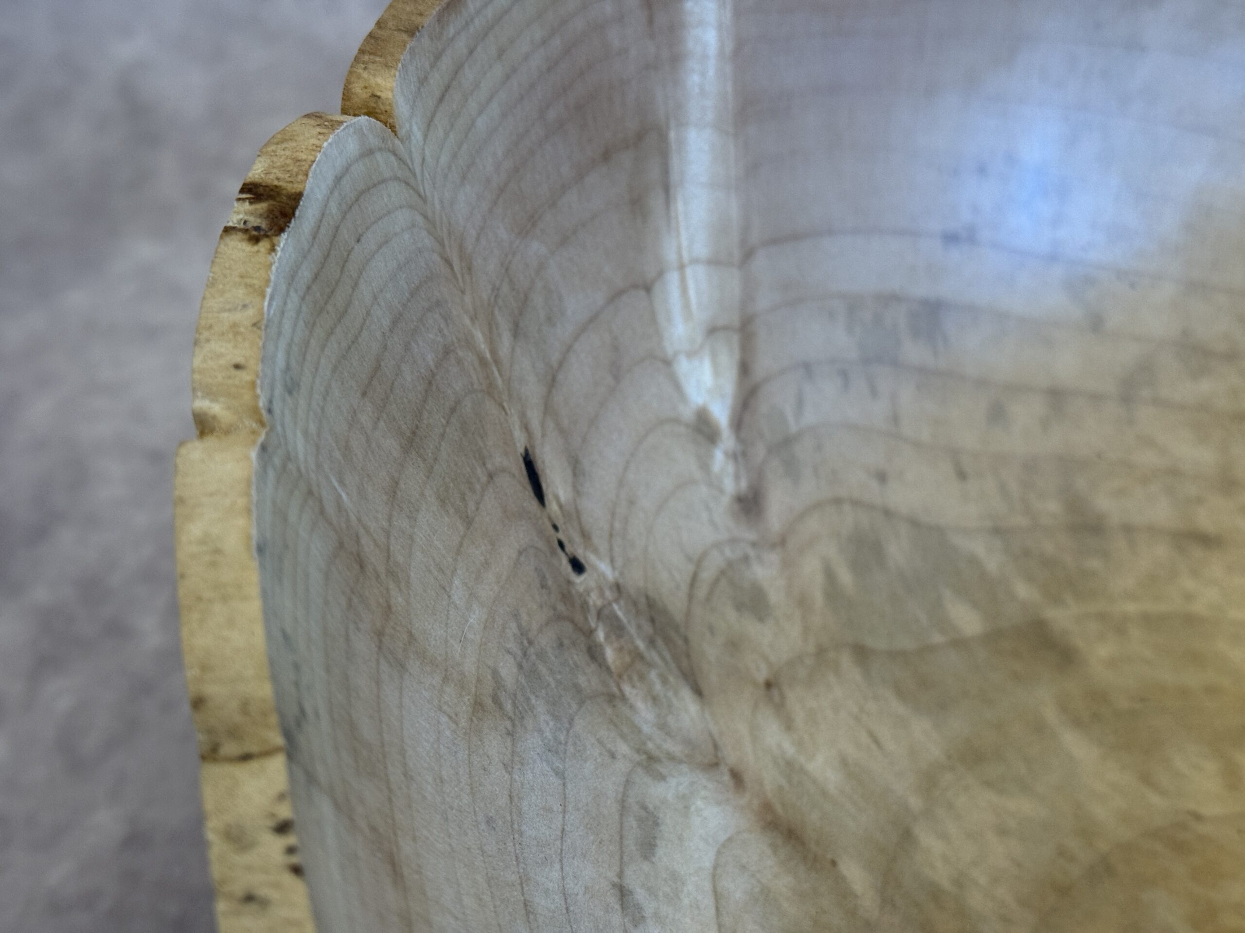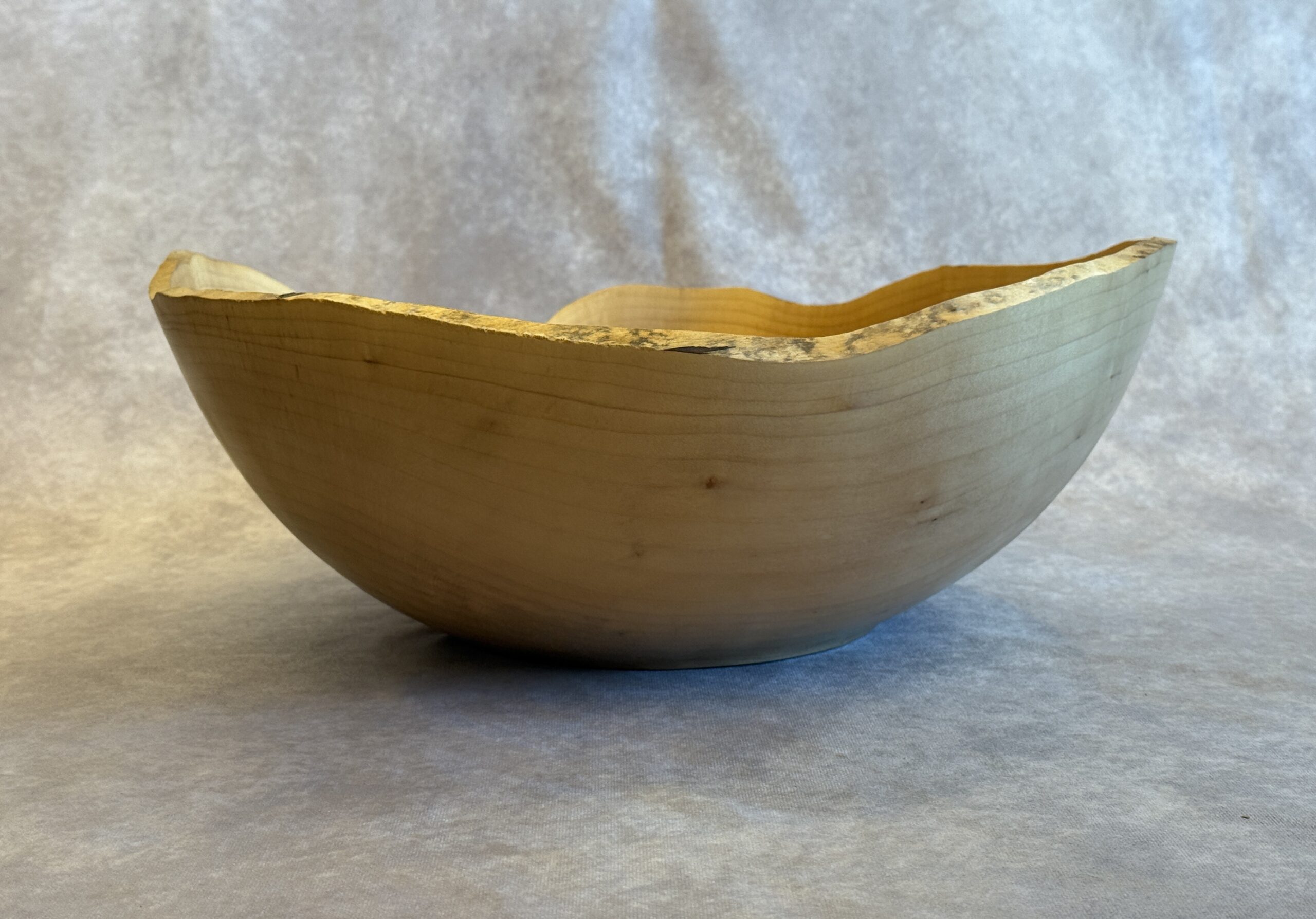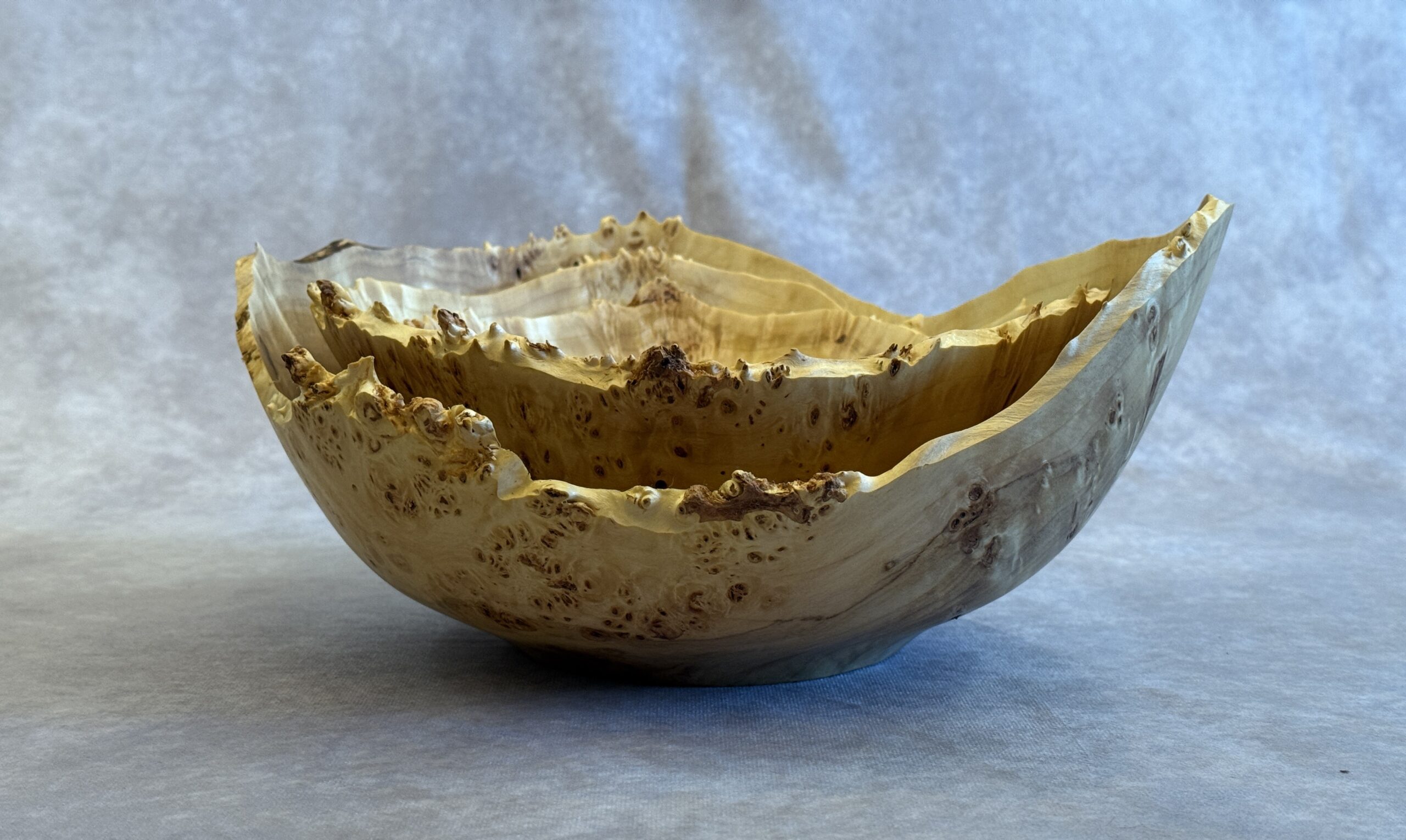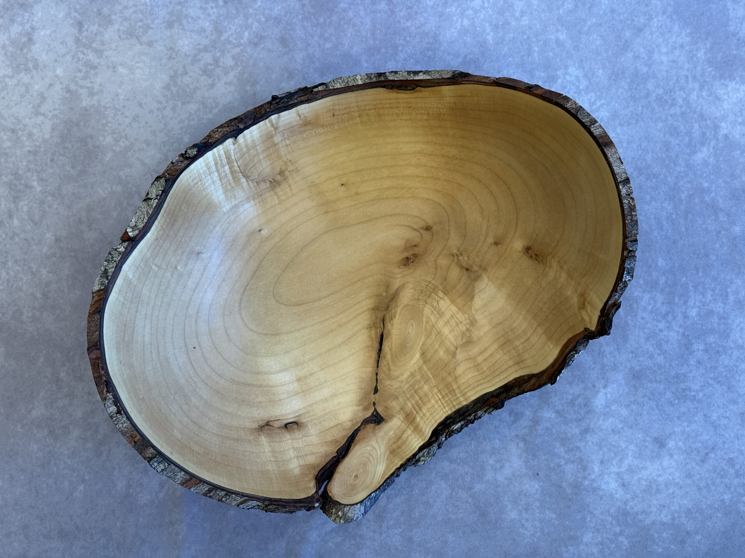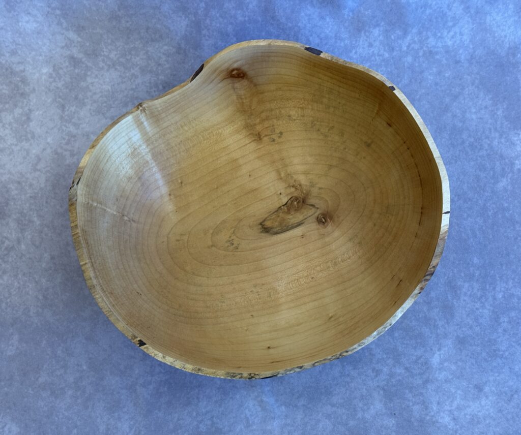 “Natural-edge” bowls are turned so that the rims are the outer face of the tree, many times including the bark. These forms are much more organic and most of the time, they are turned to their final thickness while green. This allows for the wood to warp while it dries, further imparting a more natural shape.