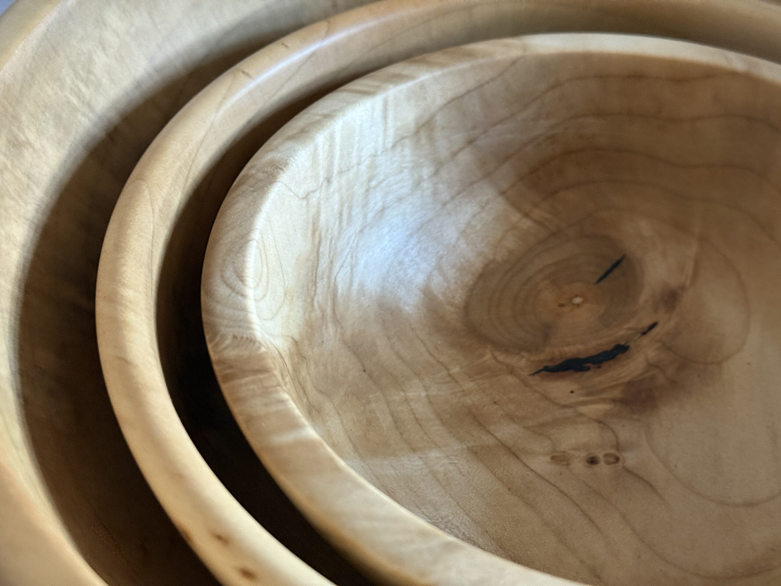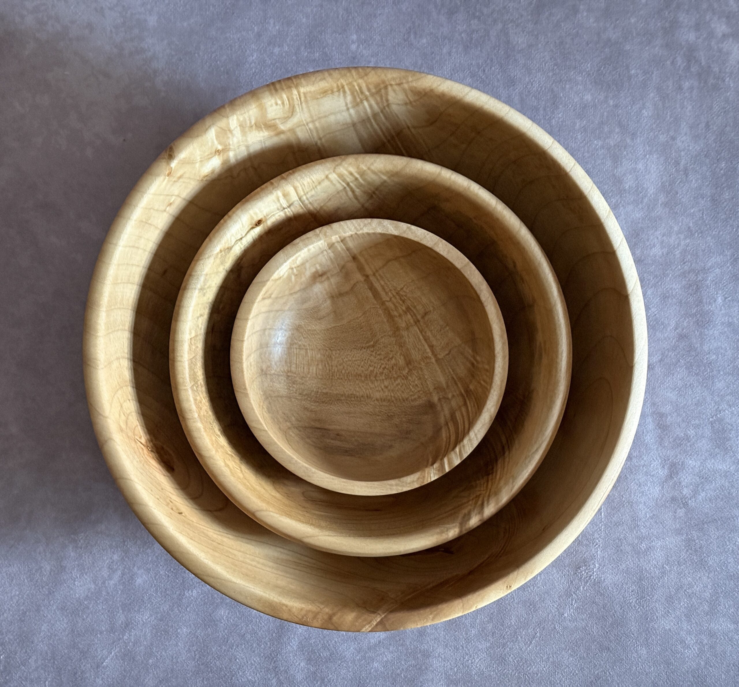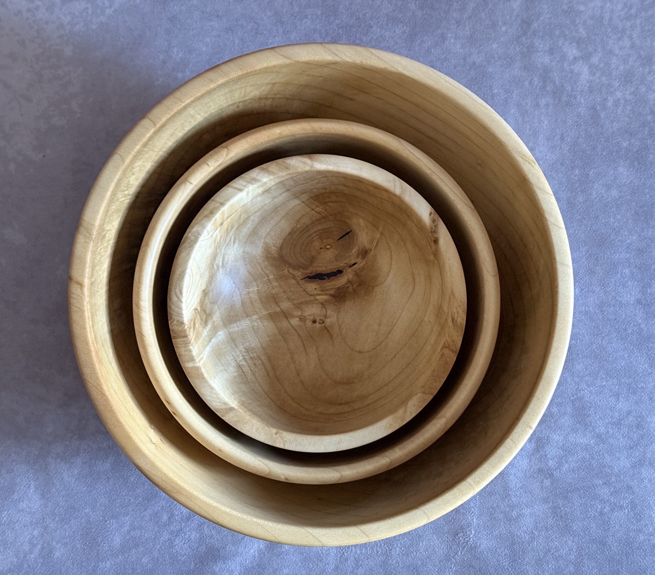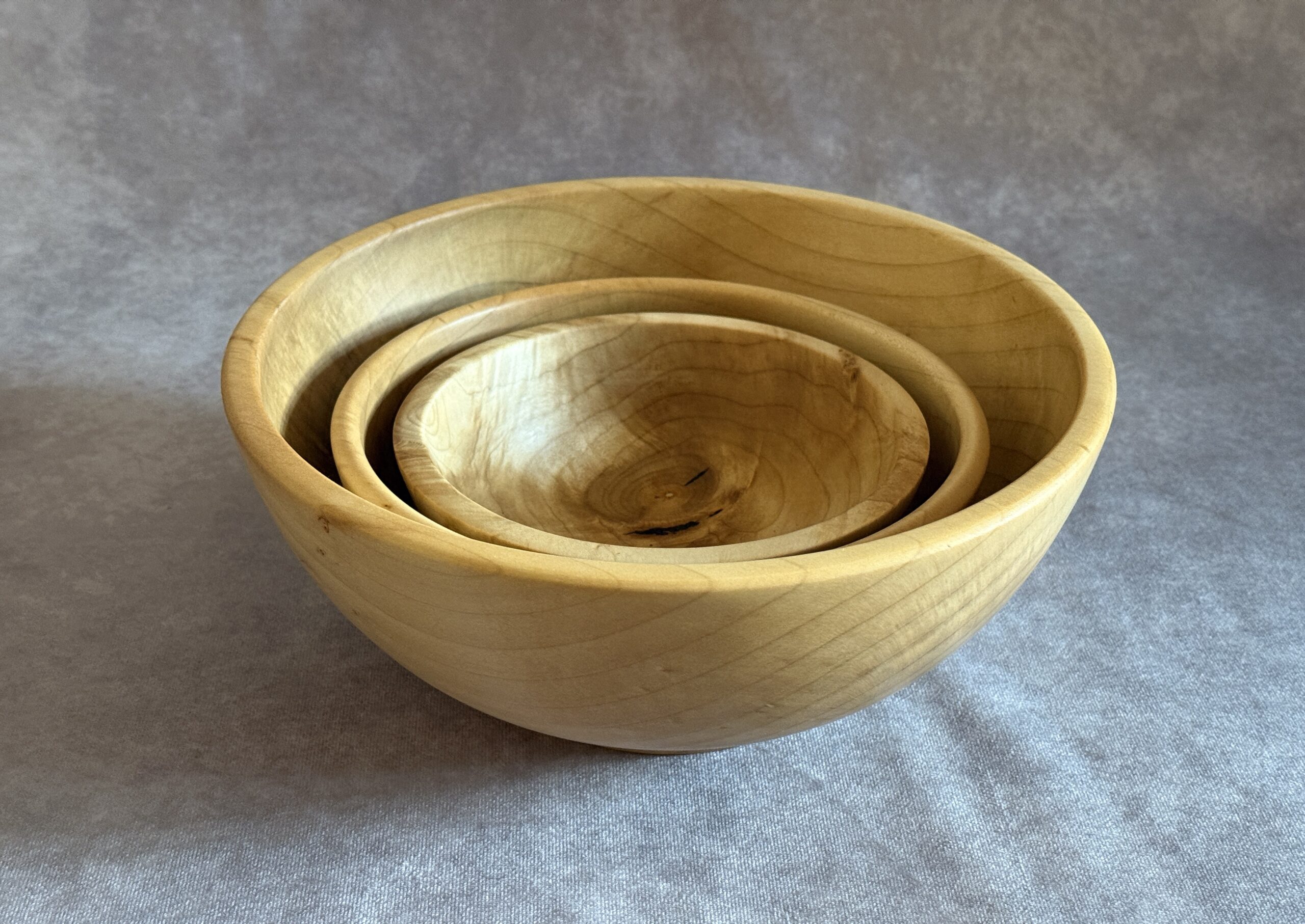 Some of these “traditional” bowls and platters are made in a 2-step process and allowed to dry in between. However, most are turned to their final shape and dimensions while green. As the wood dries, it can take on a slightly oval, organic shape that gives it a great rustic, cottage look. (Most nested sets can be purchased as individual pieces)