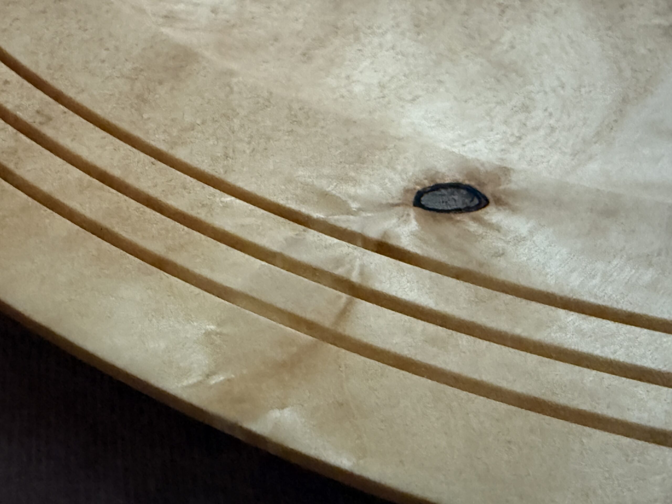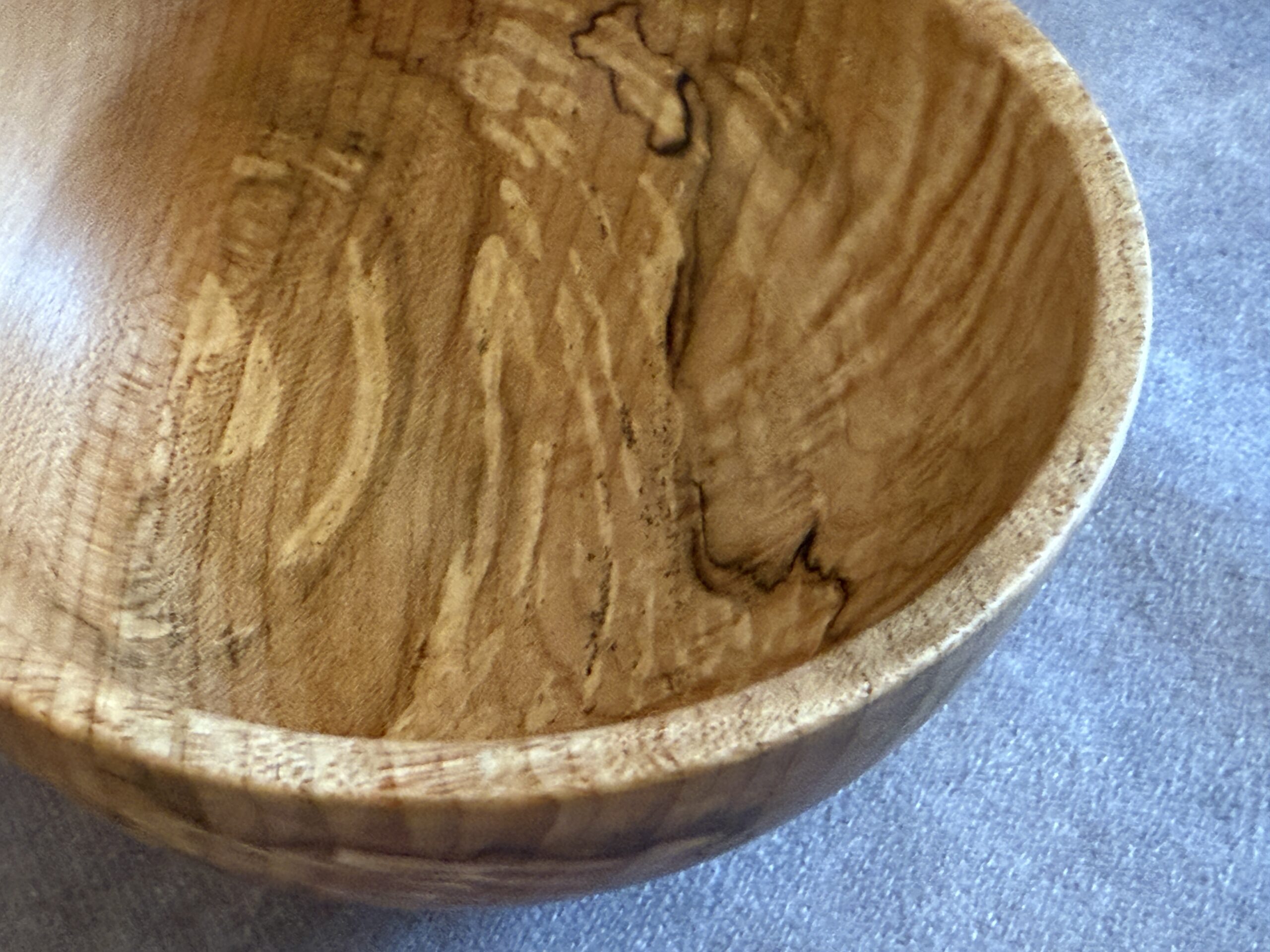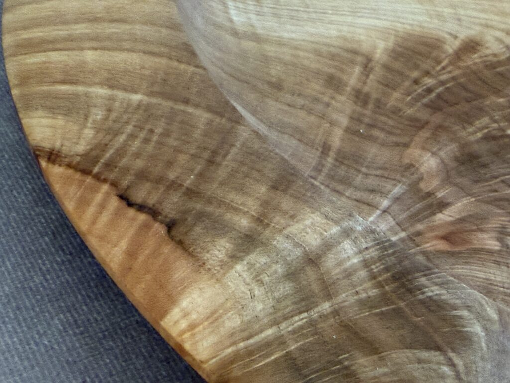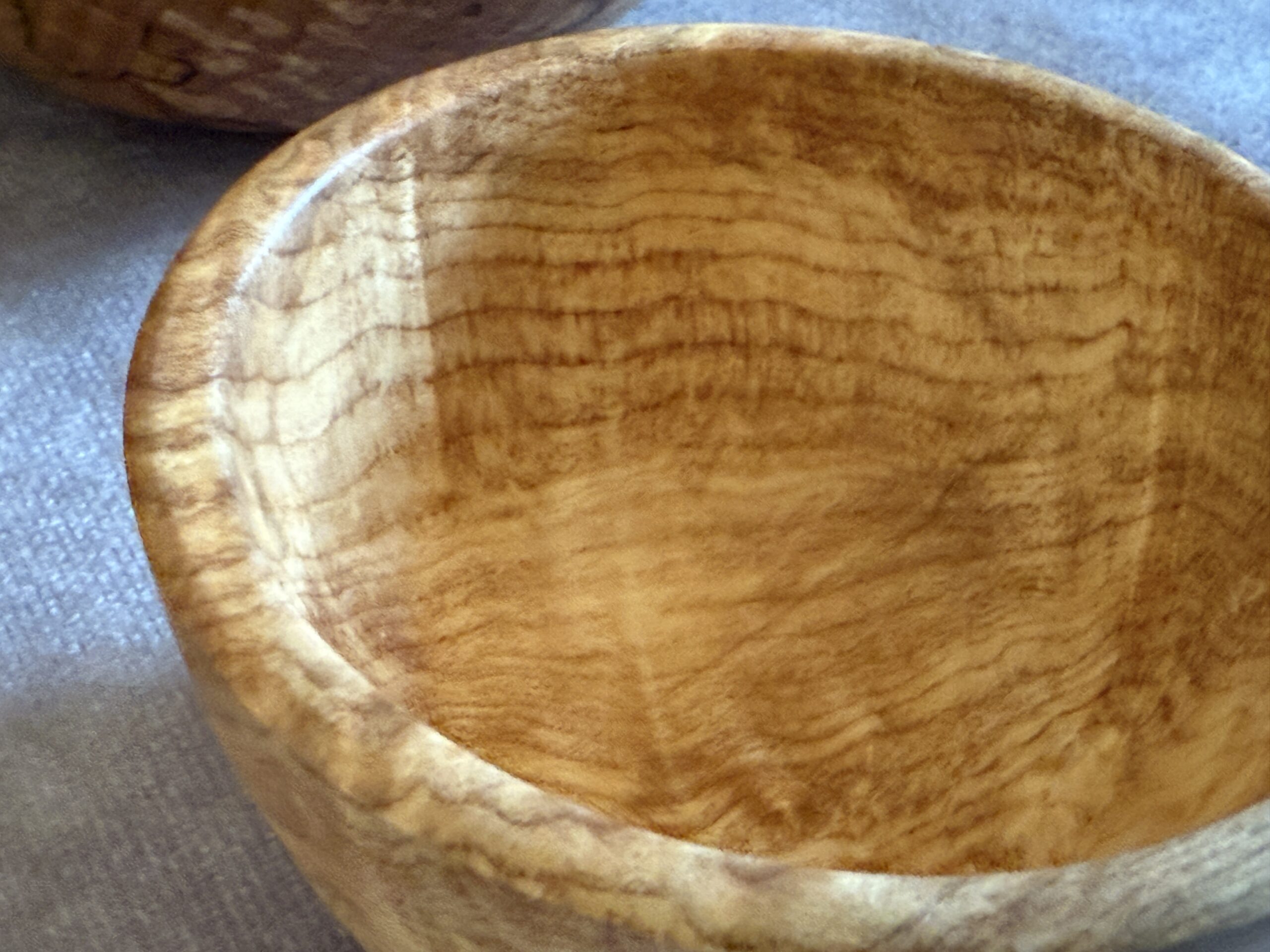 Stunning maple crotch figure with some bark inclusions. 1.25″ tall, 12″ wide