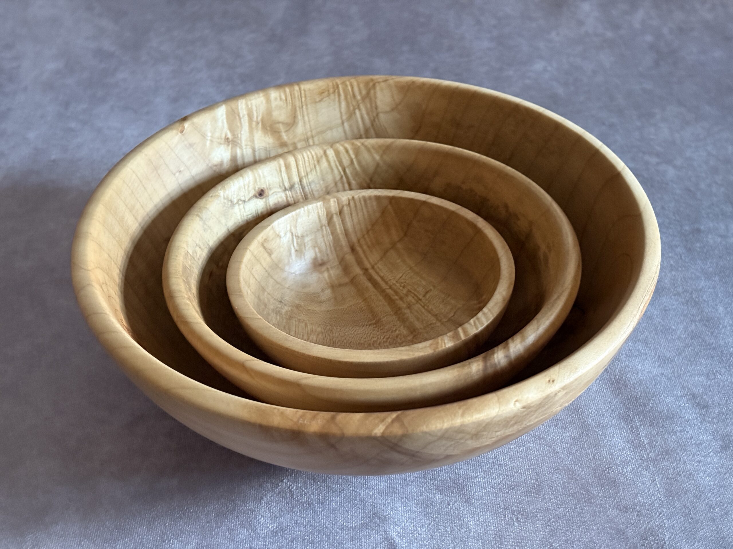 This set of bowls are made of a big leaf maple tree, salvaged from someone’s back yard in Ilwaco, WA. 4″ tall, 11.5″ wide, 3/8″ thick & 3.25″ tall, 8.5″ wide, 3/8″ thick & 2.25″ tall, 6″ wide, 3/8″ thick